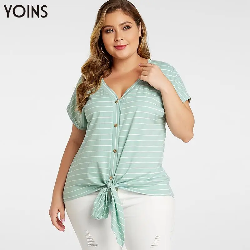 YOINS, элегантная полосатая блуза с v-образным вырезом и коротким рукавом, 2019, женские летние повседневные топы на пуговицах спереди размера пл...