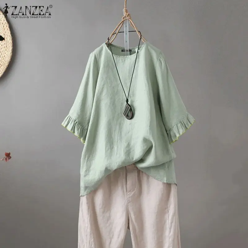 Элегантные рубашки с рюшами, женская летняя блузка ZANZEA 2020, повседневные блузы с расклешенными рукавами для работы, Женская хлопковая туника, большие размеры, топы 5XL