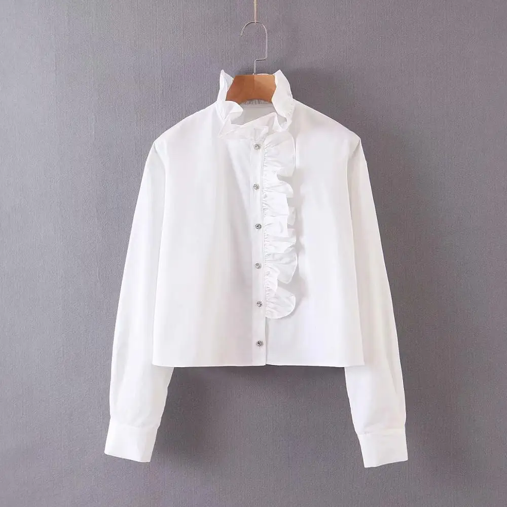 Новинка, женская мода, каскадные оборки, алмазные пуговицы, Повседневная белая рубашка, Офисная Женская блузка с длинным рукавом, roupas, шикарные топы LS6329