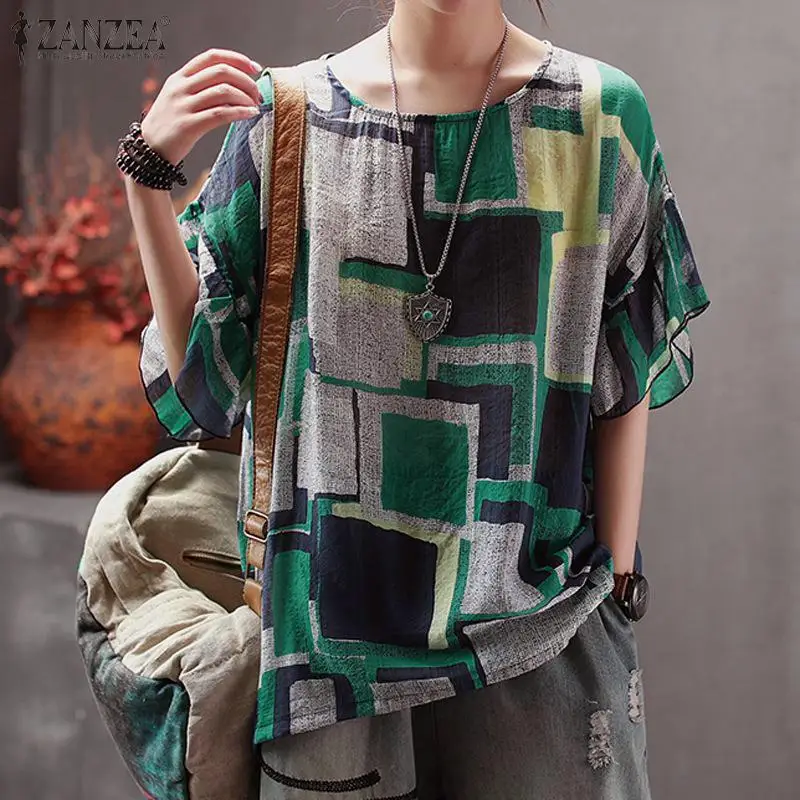 ZANZEA, летняя женская винтажная блузка с принтом, короткий рукав, свободная Женская Ретро рубашка, Повседневная сорочка, 5XL, топы, блузы