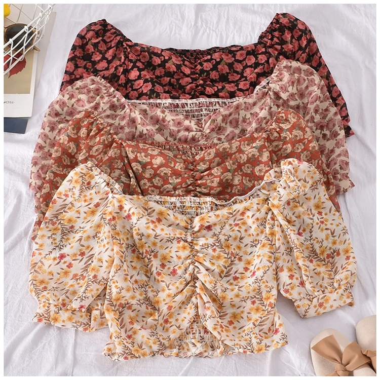 Женская рубашка с открытыми плечами в Корейском стиле, Винтажная летняя блузка с принтом, женские блузы с коротким рукавом