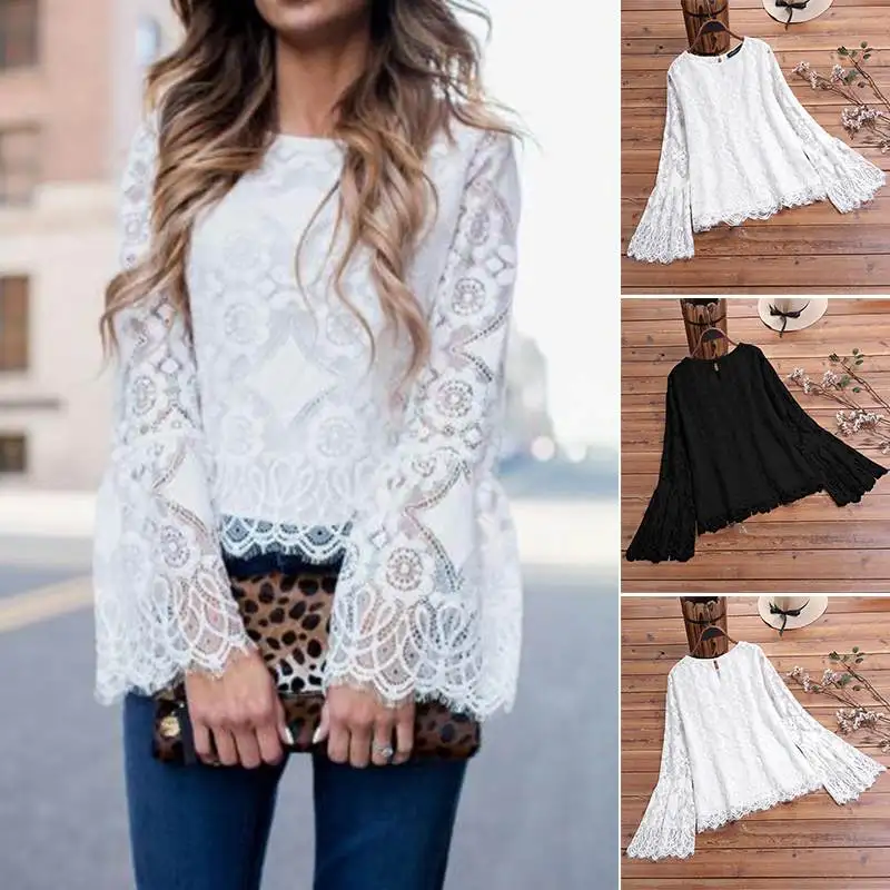 Модная женская Кружевная блуза ZANZEA с длинными расклешенными рукавами, весенние элегантные вечерние блузы, женские рубашки, сорочка, женски...