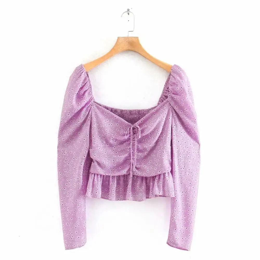 2020 Новая женская модная фиолетовая блузка с буфами на рукавах, украшенная бантом, с оборками, женские блузки, шикарные топы LS6417