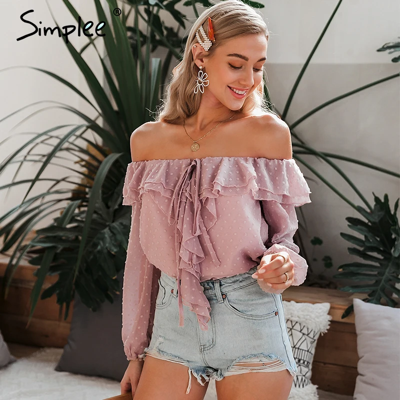 Simplee Сексуальная женская блузка с открытыми плечами и рюшами, элегантная розовая Женская шикарная весенне-летняя Праздничная блузка, повседневные блузы в горошек с длинным рукавом