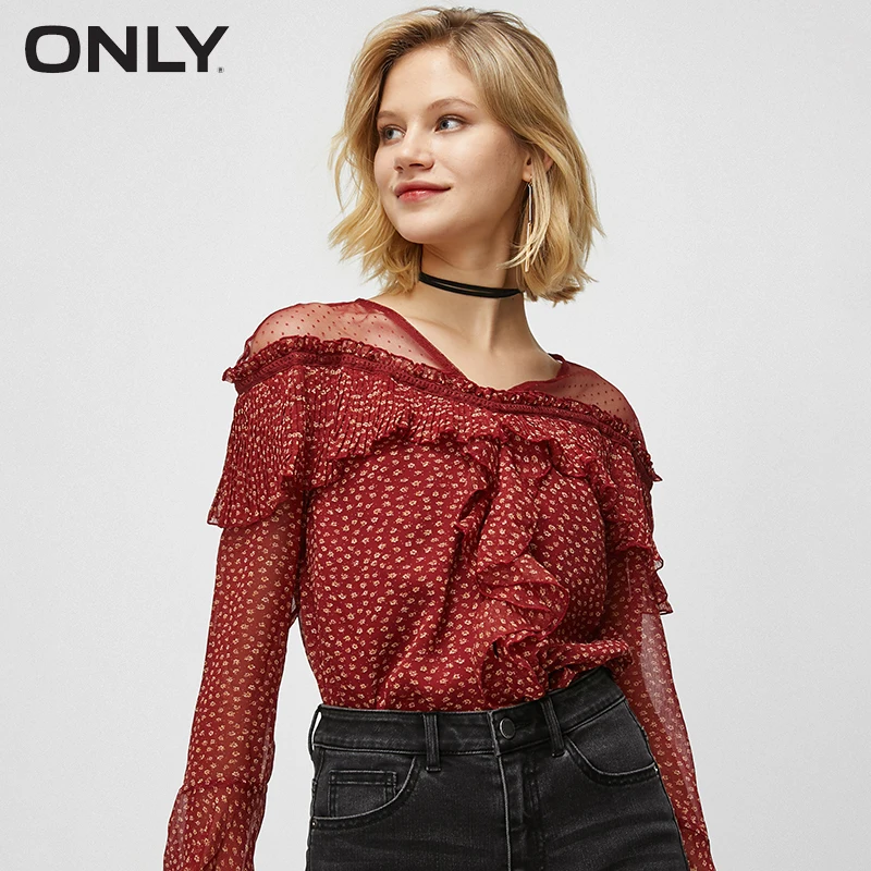 ONLY женская шифоновая рубашка с v-образным вырезом и кружевными оборками и расклешенными рукавами | 119358518