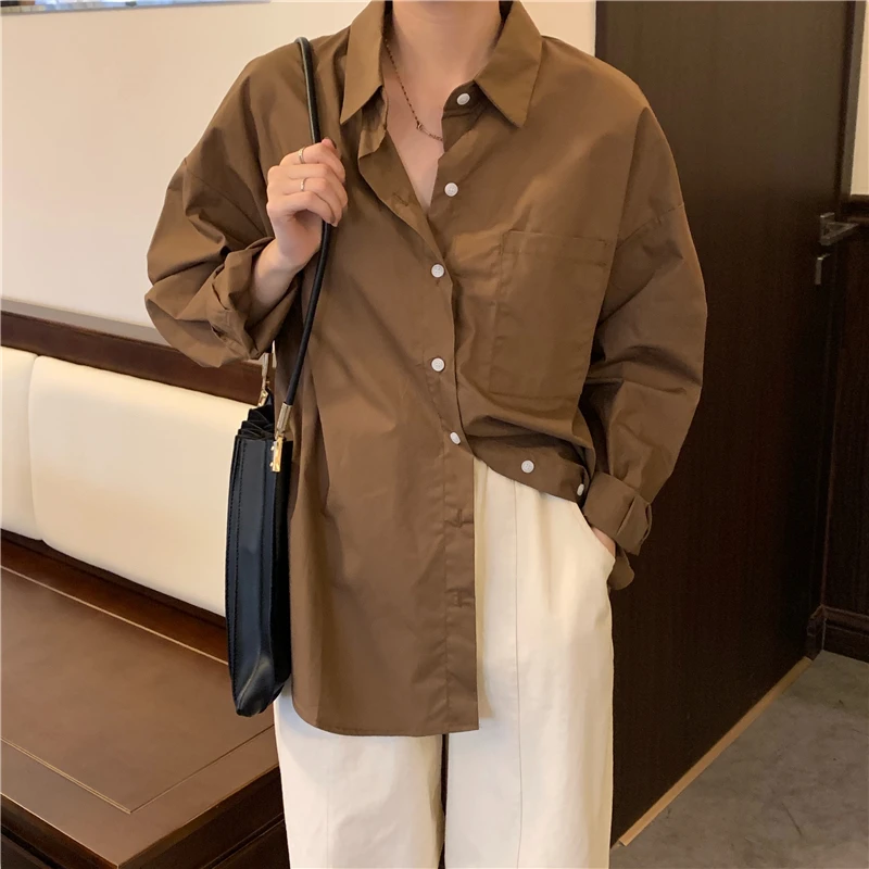 Новый кардиган с пуговицами, одноцветная женская рубашка с длинным рукавом, белые топы, коричневая Блузка для девочек размера плюс, осенние женские блузки, красные женские блузы