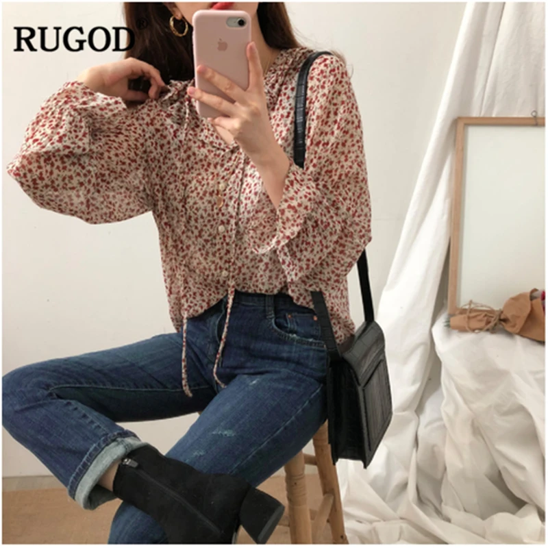 RUGOD для женщин цветочный принт шифоновая блузка 2019 весенние элегантные V средства ухода за кожей шеи топы с длинными рукавами рубашк