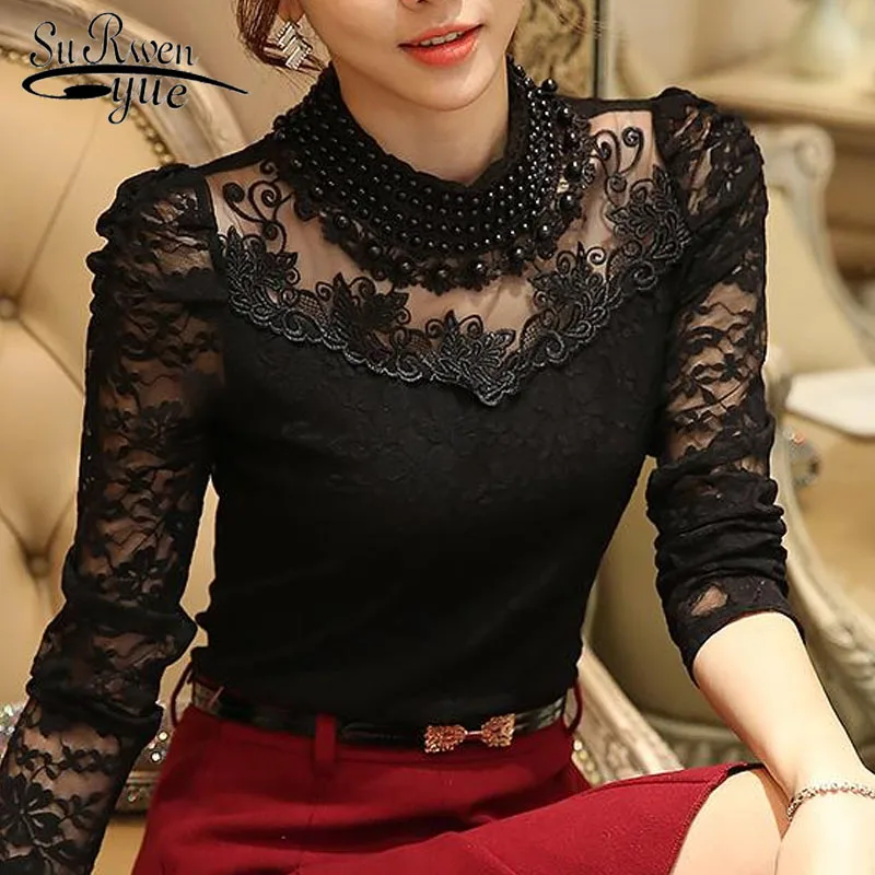 2017 новая модная блузка с длинным рукавом рубашки женские модные бисерные Блузы femininas сексуальные большие размеры кружевные топы Женская од...