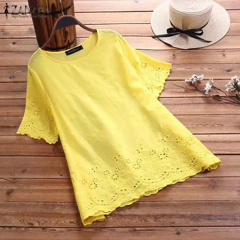 Модные топы с вышивкой женская летняя блузка 2019 ZANZEA Элегантные повседневные полые цветочные Блузы женское с коротким рукавом рубашка туника 5XL