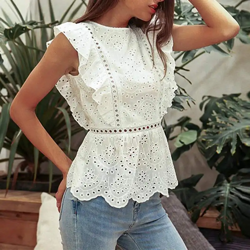 Элегантная блузка с круглым вырезом и оборками на плечах, женские рубашки, летние топы с коротким рукавом 2020, женские офисные повседневные однотонные пуловеры blusa