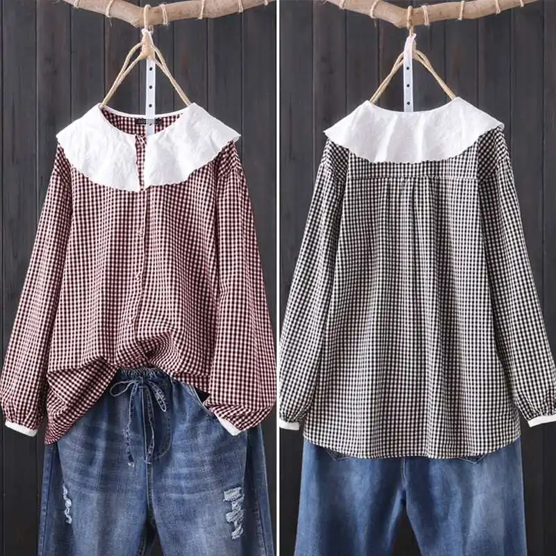 Женская туника, топы размера плюс, осень 2019, винтажная Женская клетчатая рубашка из хлопка и льна, Женская Повседневная Свободная блуза с дл...