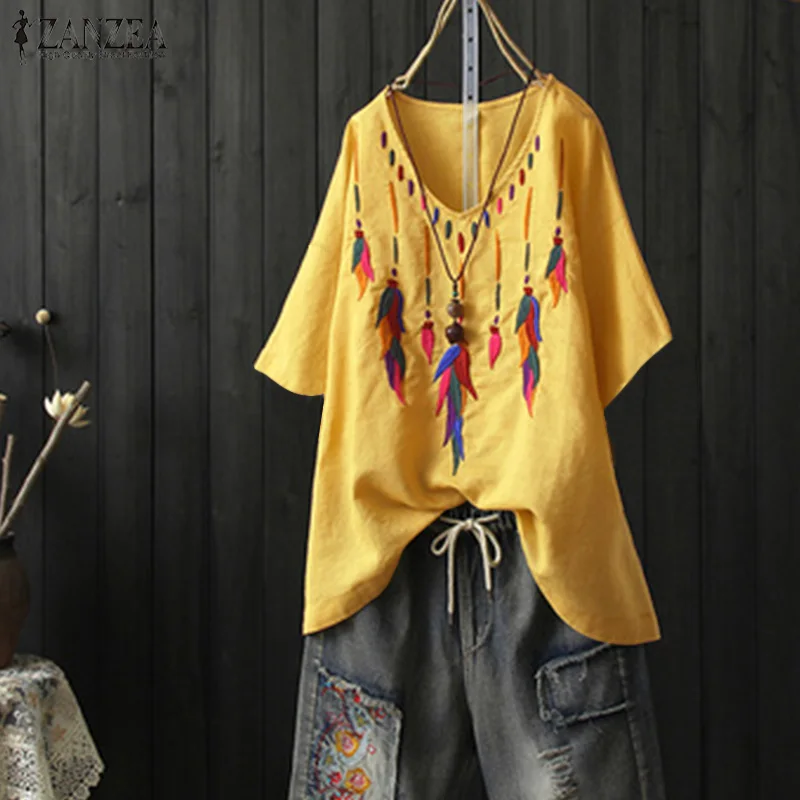 2019 женская блузка ZANZEA Лето Повседневное V шеи короткий рукав свободные рубашки Винтаж вышитые вечерние Туники женские блузки Femme