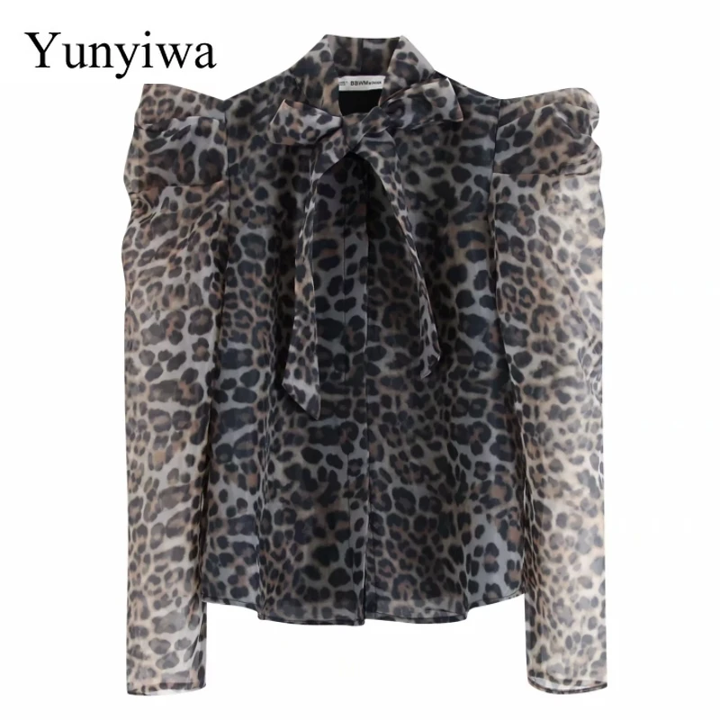 Новинка, Женский винтажный буф, рукав с животным принтом, текстура, прозрачная органза, кимоно, блузка, рубашки, женские леопардовые Блузы с бантом, топы