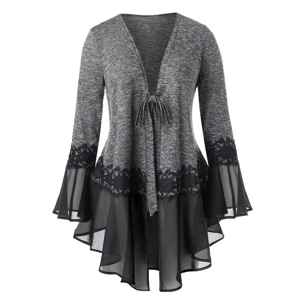 Женский шифоновый бандажный кардиган, винтажные кружевные топы с расклешенными рукавами и оборками, однотонная Повседневная Блузка, кардиганы размера плюс, уличная одежда z1216 #4