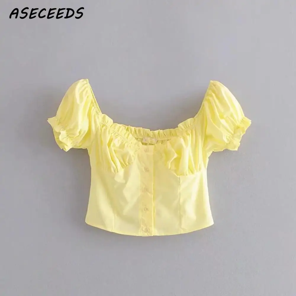 Женские летние топы 2019 Kawaii Топ на пуговицах женская блузка сексуальные с пышными рукавами женские майки и футболки уличная Корейская одежд...