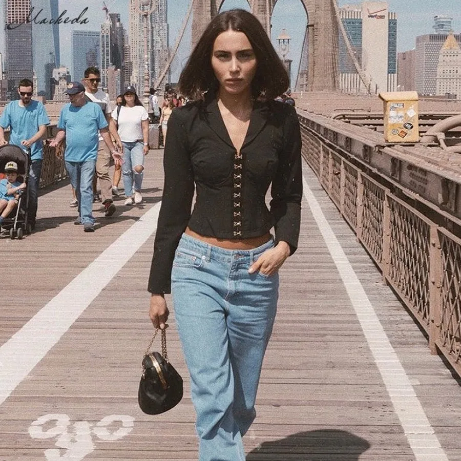 Macheda Осенняя женская черная рубашка с длинными рукавами и металлической пряжкой, черный тонкий уличный Женский Повседневный простой коротк...