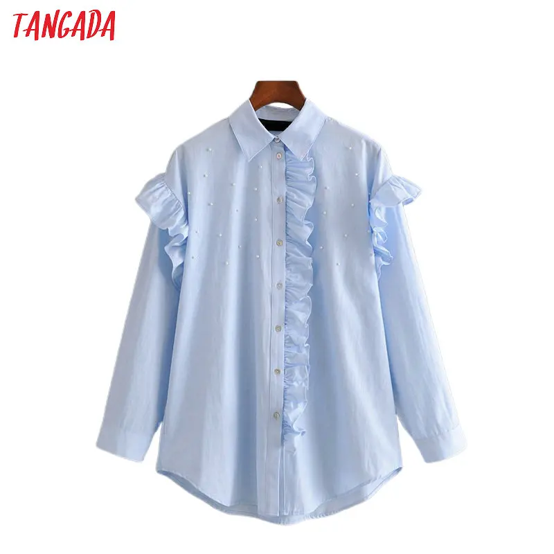 Женская блузка оверсайз Tangada, синяя блузка с жемчугом и оборками, с длинным рукавом, шикарная Женская Повседневная Свободная рубашка, blusas femininas, 3h371