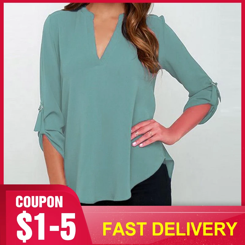 Женская блузка с глубоким v-образным вырезом, складная Свободная шифоновая рубашка с длинным рукавом, простые повседневные элегантные офисные женские топы, большие размеры 5XL