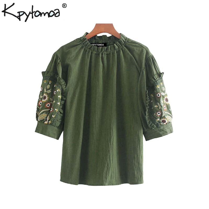 Винтажная стильная гофрированная с цветочной вышивкой блузки женские 2019 модные с круглым вырезом с коротким рукавом женские рубашки Blusas ...