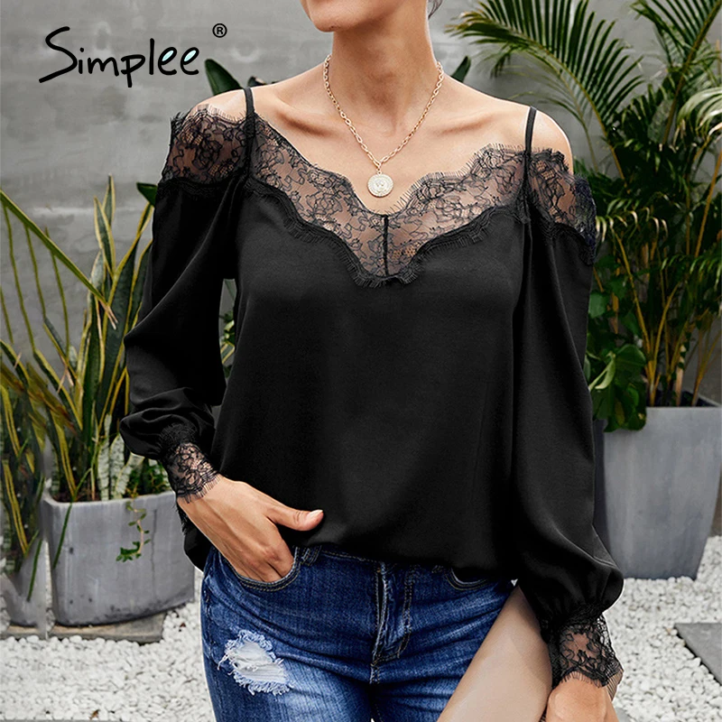 Simplee Сексуальная Черная кружевная женская блузка с v-образным вырезом, рубашка с длинным рукавом, повседневные белые топы, шикарные вечерние офисные женские топы, блузки