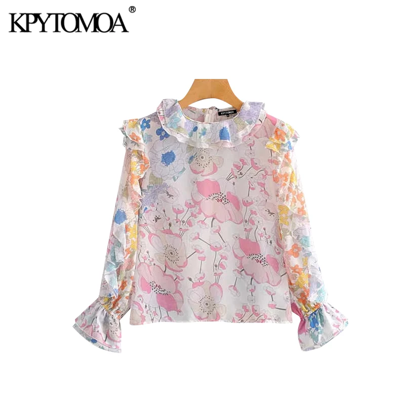 Винтажные стильные блузки с оборками и цветочным принтом для женщин 2020 Модные женские рубашки с круглым вырезом и длинным рукавом на молнии сзади блузы шикарные топы