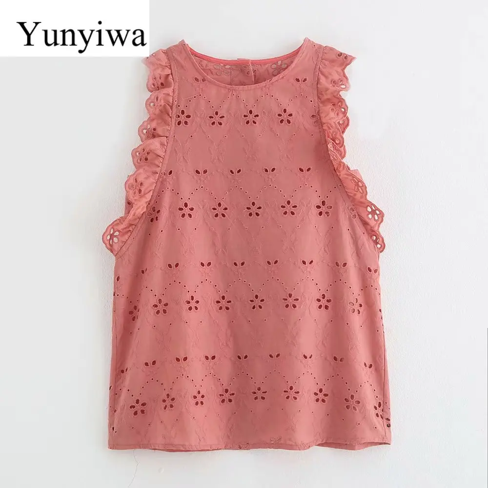 2019 Для женщин красивые прозрачные платья с вышивкой ришелье для приталенная блузка с пуговицами сзади рубашки Для женщин с круглым вырезом без рукавов с оборками, Повседневная блуза, Топ