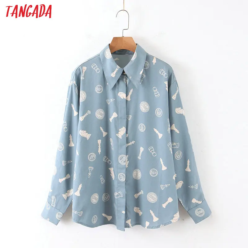 Tangada женские синие хлопковые рубашки с принтом с длинным рукавом и отложным воротником элегантные офисные женские весенние блузки QB83