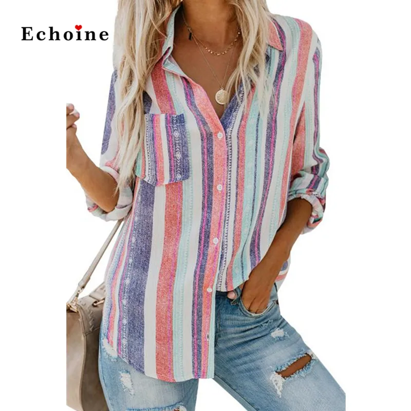 Женская рубашка, милая, достаточно полосатая, на пуговицах, блуза, с карманами, в полоску, с принтом, с длинным рукавом, повседневная, уличная туника, женская одежда