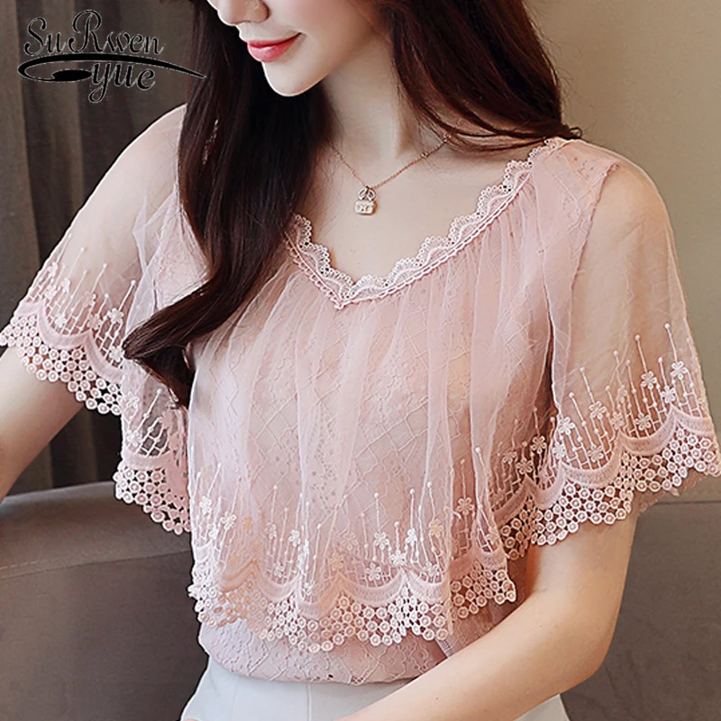Женские топы и блузки летняя кружевная блузка рубашка модные женские блузки 2019 короткий рукав Кружевной Топ женский blusa feminina 0788 30