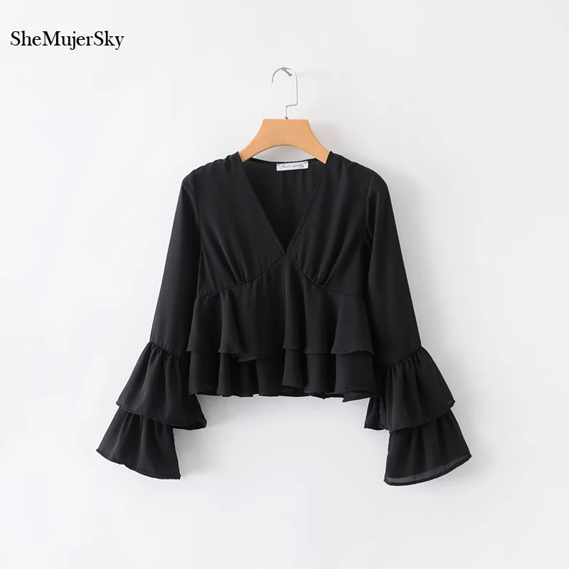 Женская шифоновая блузка SheMujerSky, черные топы с v-образным вырезом, весна-осень 2020, блузы с расклешенными рукавами