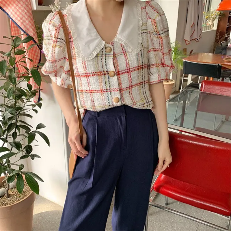 Элегантная рубашка в клетку с рюшами Alien Kitty 2020, милая Свободная рубашка с геометрическим рисунком для девочек, высококачественные элегантные женские блузки с короткими рукавами