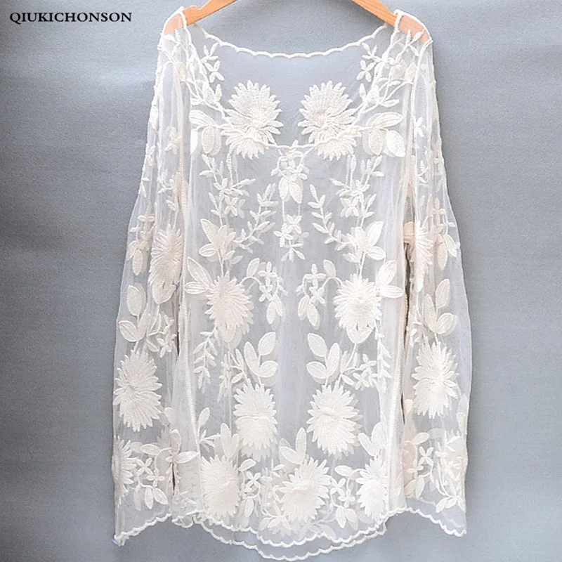 С длинными рукавами кружевные топы милые дамы Цветочная вышивка кружевные блузки женщин Солнца-доказательство О-образным вырезом sexy blusa ...