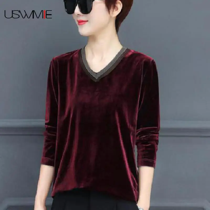 Женские топы и блузки для отдыха с золотым вельветовым низом с длинным рукавом, тонкие повседневные однотонные Женские топы с v-образным выр...