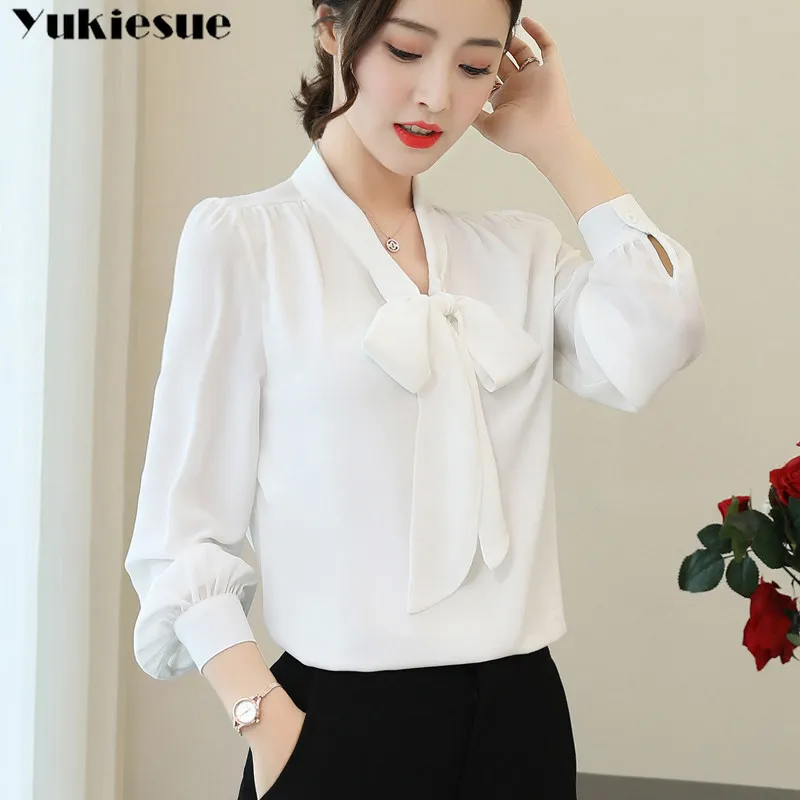 Весна Осень блузки женские топы офисные элегантные шифоновые рубашки Красный Тонкий Блузка Повседневная с длинным рукавом плюс размер бел...
