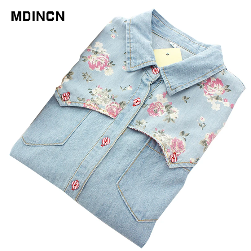 Летние Для женщин джинсовая рубашка Jean's Для женщин s цветочные джинсы Блузка с длинным рукавом плюс Размеры блузка Повседневное рубашка, то...