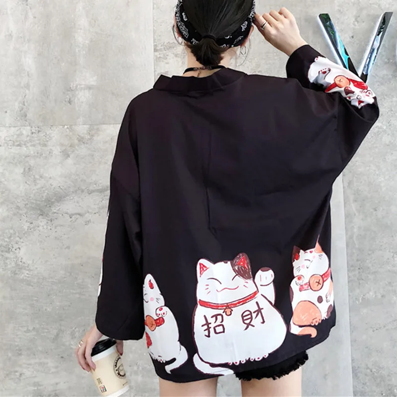 Harajuku кимоно кардиган женский s блузка 3/4 рукав Японский кот печати рубашки женские 2019 летние свободные женские повседневные блузки Женщина