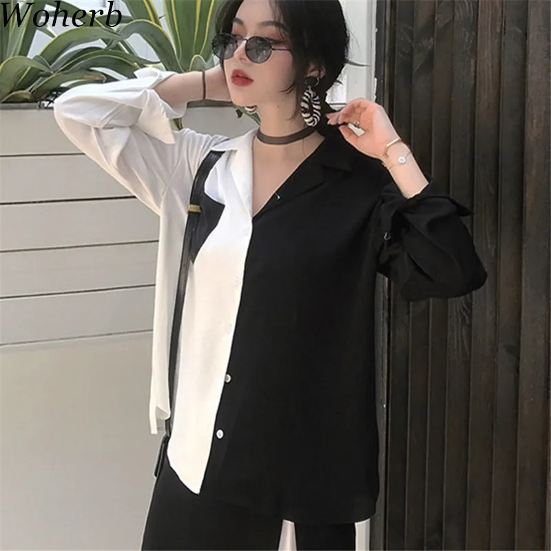 Woherb корейский Лето 2019 Харадзюку женские топы контрастные блузки черно-белые лоскутные рубашки элегантные женские топы шикарные Blusas 74820