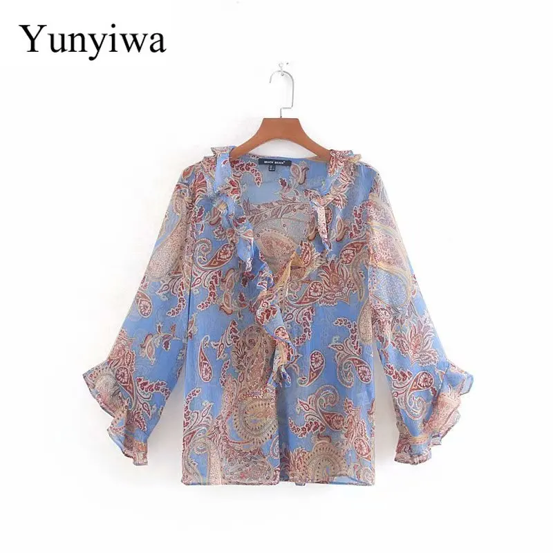 Осень 2019, женские повседневные блузки с v-образным вырезом и принтом пейсли, женские шифоновые рубашки с каскадными оборками, Ретро стиль, сорочка, топы
