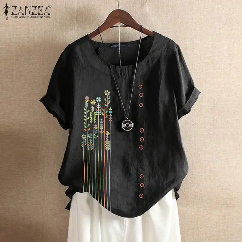 ZANZEA, Винтажная летняя рубашка, Женская богемная блузка с принтом, короткий рукав, хлопок, лен, топы, свободные, повседневные блузы, плюс размер, сорочка
