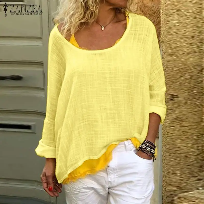 Топ Мода 2019 г. ZANZEA Осенняя блузка женская Повседневная Туника с круглым вырезом и длинными рукавами Топы однотонные хлопковые Рабочие Рубаш...