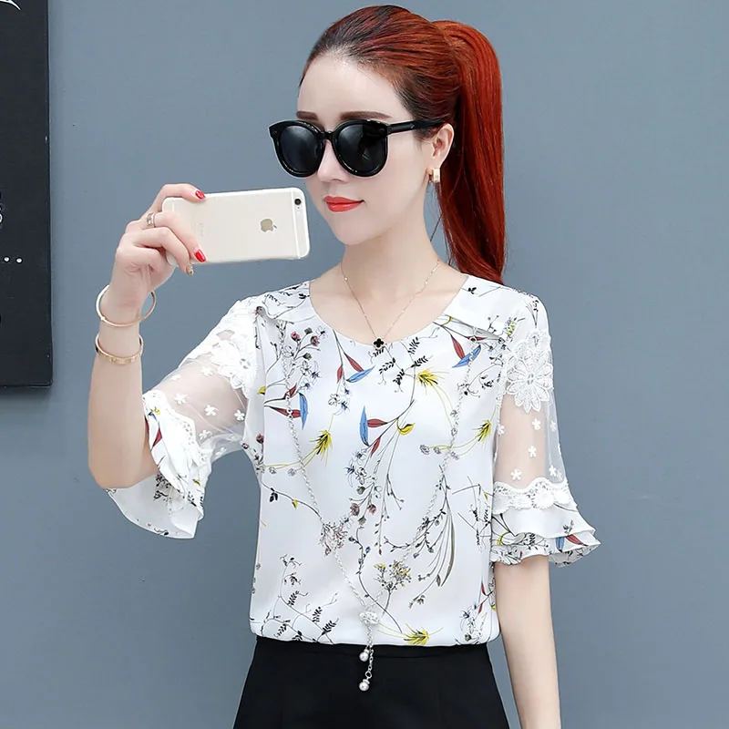 Простой Стиль Для женщин сезон: весна–лето шифон блузки рубашки леди Повседневное сетки лоскутное Flare рукавом o-образным вырезом Blusas топы ...