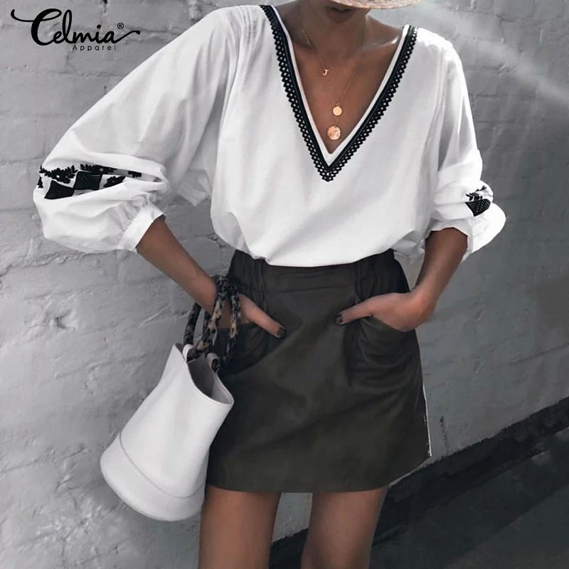 Модные топы 2019, женские сексуальные повседневные рубашки с глубоким v-образным вырезом и длинным рукавом-фонариком, винтажные блузки с принтом, свободные блузы, S-5XL