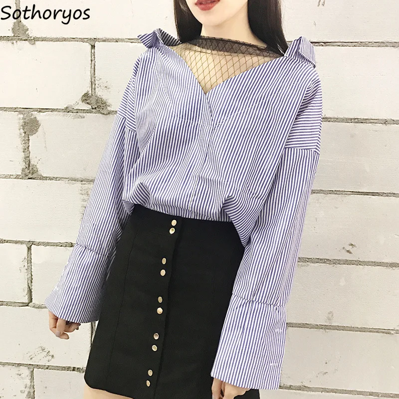 Рубашки женские с длинным рукавом полосатые свободные женские с О-образным вырезом сплайсированные модные простые рубашки корейский стиль...