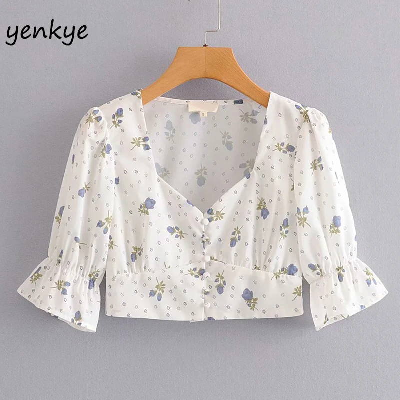 Сладкий цветочный принт укороченный Топ для женщин сексуальный V образным вырезом короткий рукав тонкий Boho летние топы DJF9018