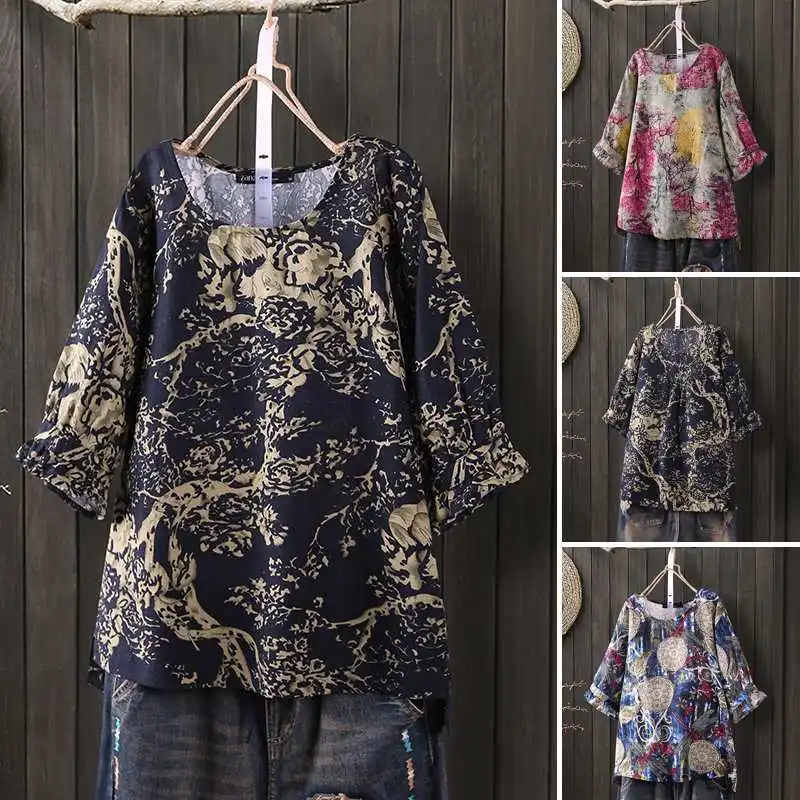 ZANZEA, женские блузы, рубашка, лето-осень 2020, богемная, с круглым вырезом, с длинным рукавом, ретро, цветочный принт, туника, свободные топы размера плюс S-5XL