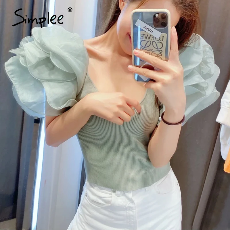 Женская блузка с длинным рукавом Simplee, черная трикотажная блузка с треугольным вырезом, каскадные оборки лепесток, 2020
