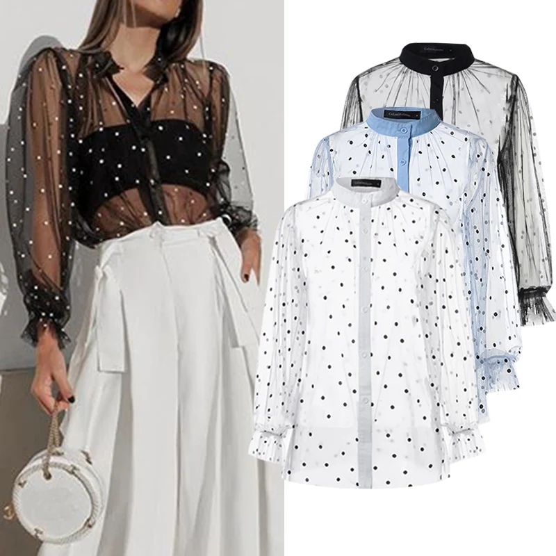 Женская элегантная блузка в горошек 2020, женская рубашка с длинными рукавами, черная, Просвечивающая, шикарный топ, повседневная, сетчатая, п...