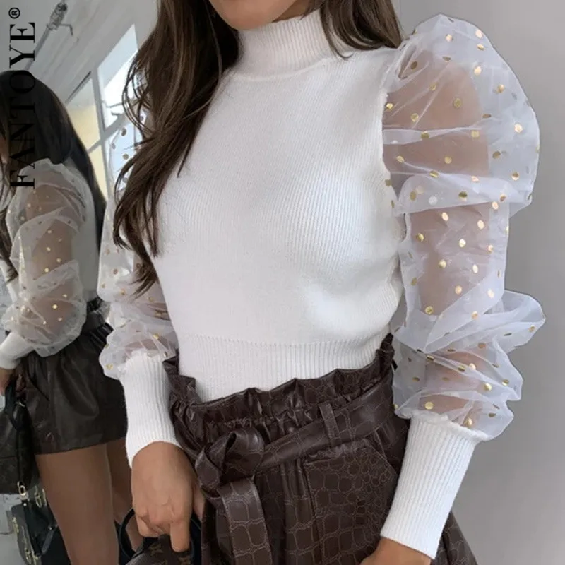 FANTOYE, сетчатая блузка с блестками и пышными рукавами, женская рубашка, из кусков, тонкая трикотажная блузка 2019, Женская винтажная водолазка, ...