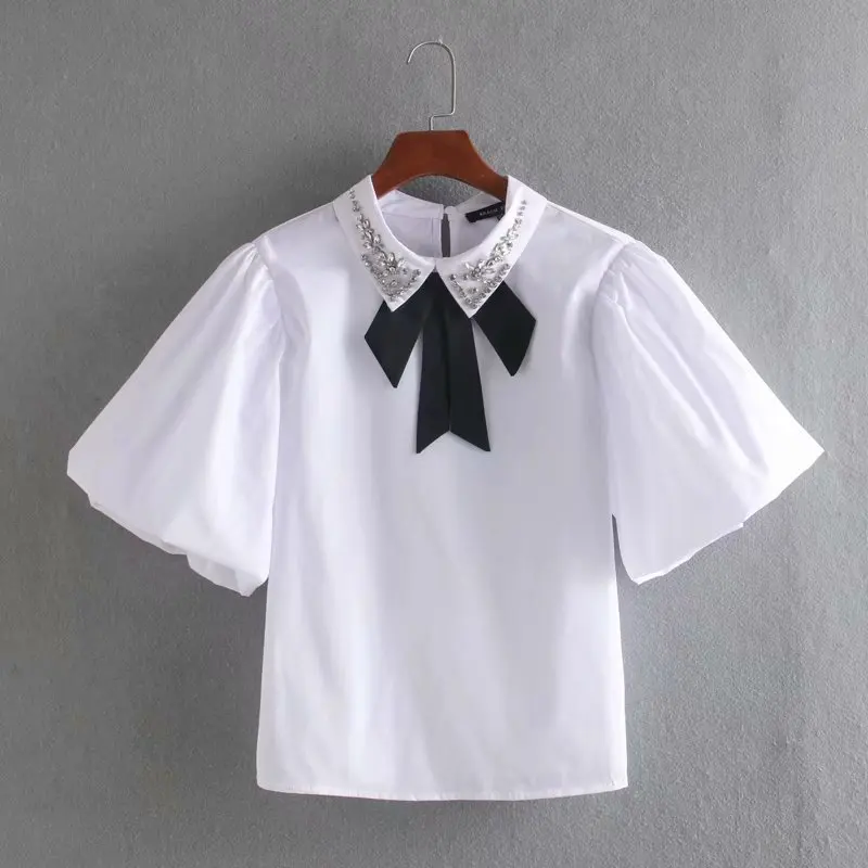 Женская блузка из поплина с бантом, украшенная бисером, весна 2020
