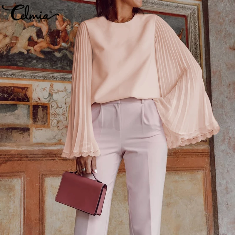 Женские шифоновые блузки с длинным Расклешенным рукавом, повседневные свободные рубашки, элегантные офисные блузы, Femininas, 2020